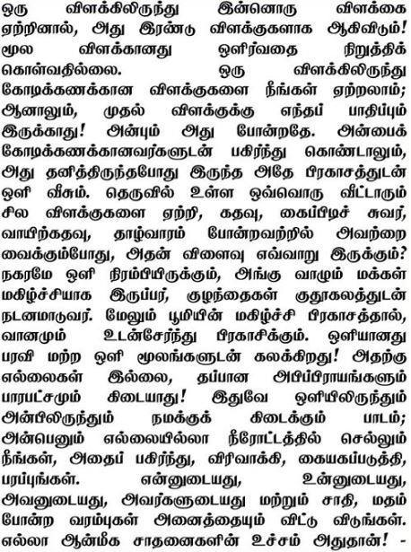 Ketika sebuah pelita dihidupkan dari pelita yang lain, ada dua pelita dimana hanya ada satu! Pelita yang pertama tidak berhenti memancarkan sinar. Engkau dapat menyalakan jutaan pelita dari satu pelita; namun, pelita yang pertama tidak akan menderita! Kasih juga adalah seperti ini. Bagilah kasih dengan jutaan maka kasih akan tetap bersinar terang saat kasih itu sendirian. Ketika setiap rumah di jalanan menyalakan beberapa pelita dan menempatkan pelita itu di depan pintu, di dinding, gerbang, beranda rumah, dsb, apa akibatnya? Kota akan diliputi dengan cahaya, penduduk akan senang, anak-anak bermain dalam suka cita dan langit bersinar dalam cahaya suka cita duniawi. Cahaya akan tersebar, bercampur dengan sumber cahaya yang lainnya! Cahaya tidak memliki batasan, tidak ada prasangka, tidak ada favorit! Ini adalah pelajaran dari pelita dan kasih; bagi, perluas, genggam, sebarkan, lepaskan batasan milikku dan milikmu, miliknya dan milik mereka, kasta dan keyakinan, dalam satu aliran kasih yang tanpa batas. Itu adalah puncak dari semua latihan spiritual!