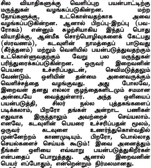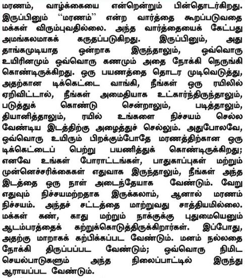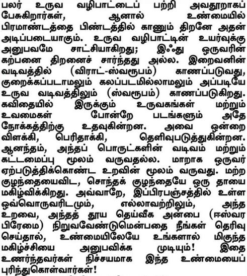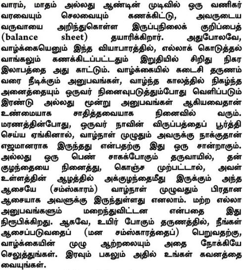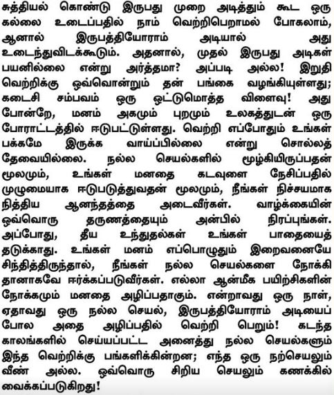 إن عشرين ضربة مطرقة يمكن ألا تكسر صخرة ولكن الضربة الحادية والعشرين يمكن أن تكسرها! وهل هذا يعني أن الضربات العشرين السابقة كانت بلا جدوى؟ لا، إن كل ضربة ساهمت في النجاح النهائي، وإن الضربة الأخيرة كانت هي المجموع النهائي لكل الضربات، كذلك أيضا إن الفكر منغمس في الصراع مع العالمين الداخلي والخارجي، لا حاجة للقول بأن النجاح سيكون دوماً حليفك، لكن يمكن للإنسان أن يحصل على الغبطة المستمرة بانشغاله في الأعمال الجيدة وبإشباع الفكر بمحبة الإله. أشبع كل لحظة بذلك الحب المقدس، عندها فإن النزعات الشيطانية سوف لن تجرؤ على الاقتراب منك، لأن فكرك دوماً متخم بالإله سوف يتجه للأعمال الجيدة فقط، إن غاية الانضباط الروحي تدمير الهيجان الفكري في يوم من الأيام، ولا بد من نجاح أحد الأعمال الجيدة بذلك. تماماً مثل نجاح الضربة الحادية والعشرين بكسر الحجر، ولتحقيق هذا النصر فإن الأعمال الجيدة السابقة ستساهم في هذا النجاح ولن يضيع أي عمل جيد مهما كان صغيراً.