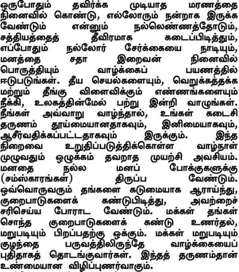 Zwanzig Hammerschläge könnten es nicht schaffen, einen Stein zu zerbrechen, aber der einundzwanzigste Schlag könnte ihn brechen. Bedeutet das, dass zwanzig Schläge erfolglos blieben? Nein! Jeder trug seinen Teil zum endgültigen Erfolg bei. Das letzte Ergebnis war der kumulative Effekt! Auch der Geist befindet sich in einem Kampf mit der Welt, sowohl innerlich als auch äußerlich. Unnötig zu sagen, Erfolg kann nicht immer Euer Los sein. Ihr werdet sicherlich ewige Glückseligkeit erlangen, indem ihr in gute Werke eintaucht und euren Geist mit Liebe zu Gott sättigt. Erfüllt jeden Moment des Lebens mit Liebe. Dann werden böse Neigungen euren Weg nicht behindern. Wenn Euer Geist immer beim Herrn wohnt, werdet Ihr zu guten Taten hingezogen. Das Ziel aller spirituellen Praxis ist die Zerstörung des Geistes, und eines Tages wird es einer guten Tat gelingen, es zu zerstören, wie der einundzwanzigste Schlag! Alle guten Taten, die in der Vergangenheit getan wurden, tragen zu diesem Triumph bei. Keine edle Tat ist unwürdig, jede kleine Handlung zählt!
