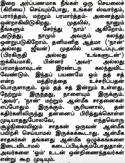 Lorsque vous accomplissez une activité (kriya) comme une offrande au Seigneur, votre bien, le bien supérieur et le plus haut bien (swartha, parartha et paramaartha) - tous deviennent un. D'abord, vous et moi devenons nous. Ensuite, nous et Lui devenons unifiés. L'âme individuelle (le " je " ou jiva) doit d'abord s'identifier avec la création (prakriti ou " tu ") et ensuite avec l'Esprit suprême (Lui ou Paramatma). Ce voyage est la signification du chant du mantra Om Tat Sat. Aujourd'hui, hier et demain, Om Tat Sat, est, était et sera. Il et moi, et la pratique spirituelle (sadhana) est toujours là. Tout comme le soleil est inséparable et n'est jamais séparé de ses rayons, en aucun cas un aspirant ne devrait être sans sa pratique spirituelle. Ce n'est que lorsque les aspirants spirituels adhèrent à leurs disciplines spirituelles d'une manière aussi incessante que l'on peut dire qu'ils sont un avec Om.