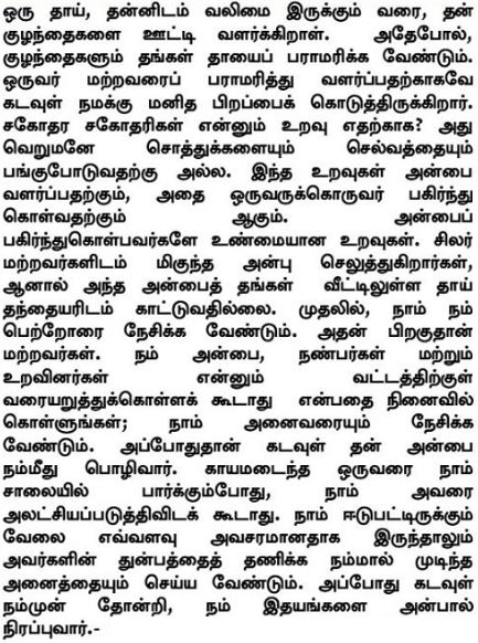 Sepanjang ibu memiliki kekuatan maka ibu memelihara anak-anaknya. Anak-anak seharusnya menjaga ibu mereka dengan cara yang sama. Tuhan telah memberikan kita kelahiran sebagai manusia untuk menjaga dan memelihara satu sama lain. Apa tujuan hubungan dari saudara? Bukan hanya untuk berbagi kekayaan. Hubungan ini adalah untuk mengembangkan kasih dan berbagi kasih satu dengan yang lainnya. Hubungan yang sejati adalah mereka yang berbagi kasih dengan yang lainnya. Beberapa orang mengungkapkan kasih yang besar yang lainnya, namun tidak memperlihatkan kasih yang sama kepada ibu dan ayah mereka di dalam rumah sendiri. Pertama dan utama, kita seharusnya mencintai orang tua kita sendiri baru kemudian setiap orang yang lainnya. Ingatlah kita seharusnya tidak membatasi kasih kita pada teman-teman dan kerabat kita saja; kita seharusnya mengasihi semuanya. Hanya demikian Tuhan akan mencurahkan kasih-Nya kepada kita. Ketika kita melihat orang terluka di jalan, kita seharusnya tidak memperlihatkan sikap acuh pada mereka. Betapapun mendesaknya pekerjaan yang harus kita lakukan, kita harus melakukan sedikit untuk meringankan penderitaan mereka. Kemudian Tuhan akan hadir di depan kita dan mengisi hati kita dengan kasih.