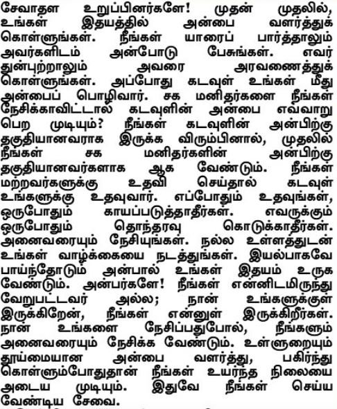 Para anggota dari Sevadal! Pertama dan utama, tingkatkan cinta kasih di dalam hatimu. Siapapun yang engkau temui, berbicaralah pada mereka dengan kasih. Bawalah semua mereka yang kesusahan dekat denganmu. Kemudian Tuhan akan mencurahkan kasih-Nya kepadamu. Bagaimana engkau dapat menerima kasih Tuhan jika engkau tidak menyayangi sesamamu? Jika engkau ingin menjadi layak untuk kasih Tuhan, maka pertama dan utama engkau seharusnya menjadi layak untuk kasih dari sesamamu. Tuhan akan membantumu jika engkau membantu yang lainnya. Selalulah menolong, jangan pernah menyakiti. Jangan pernah menjadi penyebab masalah bagi siapapun juga. Kasihi semuanya. Jalani hidupmu dengan kebaikan di dalam hati. Hatimu seharusnya mencair dengan aliran kasih yang bebas. Engkau yang terkasih! Engkau tidaklah berbeda dengan-Ku; Aku ada di dalam dirimu dan engkau ada di dalam diri-Ku. Sebagaimana Aku mengasihimu, engkau seharusnya juga mengasihi semuanya. Engkau dapat mencapai hal yang luar biasa hanya ketika engkau mengembangkan dan berbagi kasih yang suci dari dalam diri. Ini adalah pelayanan yang ahrus engkau lakukan.