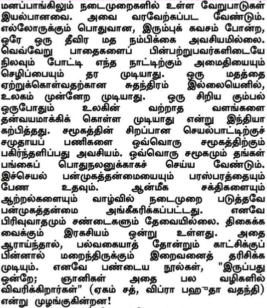 Les différences d'attitudes et de pratiques sont naturelles et doivent être accueillies favorablement ; il n'est pas nécessaire d'avoir une foi absolue, à toute épreuve, ferme. La rivalité entre ceux qui suivent des voies différentes ne peut apporter la paix et la prospérité à aucun pays. Sans la liberté d'adopter la foi, le monde ne peut pas progresser. L'Inde a enseigné qu'un petit groupe ne peut jamais commander les ressources inépuisables du monde. Pour le fonctionnement efficace de la communauté, il est nécessaire de répartir le travail de la communauté entre les différentes parties du peuple et de donner à chacun la tâche de contribuer au bien commun. Cela facilite la diversité et la mutualité. Les diversités ont été approuvées pour l'application pratique des pouvoirs et des potentialités spirituelles, il n'y a donc pas besoin de fractionnement et de luttes. Il y a un sens du mystère envoûtant qui, s'il est exploré, vous permettra de visualiser Celui qui est à la base de la multitude. C'est pourquoi les textes anciens proclament : " Un seul existe ; les sages le décrivent de multiples façons " (Ekam sat, viprah bahudha vadanti) !