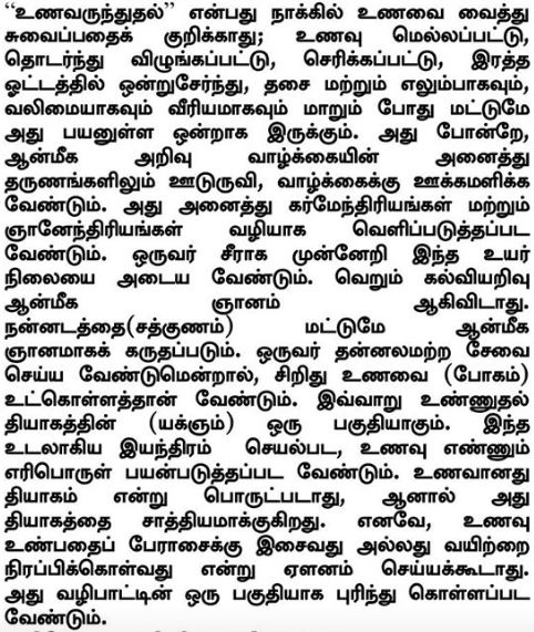 "Essen" bedeutet nicht, Essen auf die Zunge zu legen und es zu probieren. Es lohnt sich nur, wenn Nahrung gekaut, geschluckt, verdaut, in den Blutkreislauf assimiliert und in Muskel und Knochen verwandelt wird, in Kraft und Stärke. Auch das spirituelle Verständnis muss alle Momente des Lebens durchdringen und beleben. Es muss durch alle Organe und Sinne (Karmendriyas und jnanendriyas) ausgedrückt werden. Man muss sich stetig anstrengen um diese hohe Stufe erreichen. Bloße Anhäufung des Lernens ist keine spirituelle Weisheit (jnana). Nur gutes Verhalten (sat-guna) ist spirituelle Weisheit. Damit man selbstlosen Dienst leisten kann, muss ein wenig Essen (Bhoga) zugeführt werden. Ein solches Essen ist Teil des Opfers (yajna). Um diese Körpermaschine funktionieren zu lassen, muss der Kraftstoff von Lebensmitteln verwendet werden. Essen ist kein Opfer, aber es macht Opfer möglich. Daher darf das Essen nicht so angelacht werden, dass man damit die Gier oder den Magen ernährt. Es muss als Teil der Anbetung verstanden werden.
