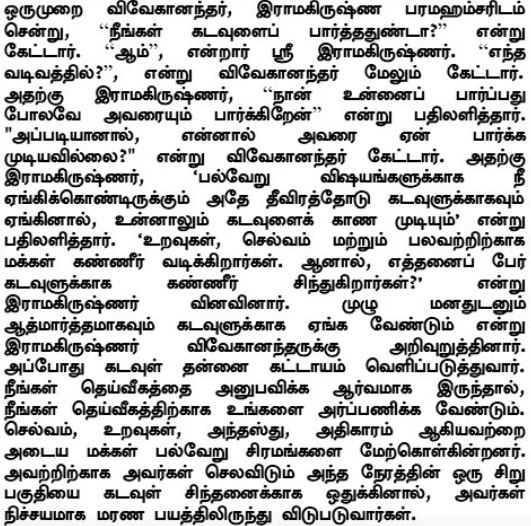 Einmal ging Vivekananda zu Swami Ramakrishna Paramahamsa und fragte ihn: "Hast du Gott gesehen?" "Ja", sagte Sri Ramakrishna. "In welcher Form?", fragte Vivekananda. Ramakrishna antwortete: "Ich sehe ihn so, wie ich dich sehe." "Warum kann ich ihn dann nicht sehen?" Ramakrishna erklärte, dass, wenn er sich nach Gott sehnte, mit der gleichen Intensität, mit der er sich nach vielen anderen Dingen sehnte, auch er Gott erfahren würde. Ramakrishna sagte, dass die Menschen Tränen für Beziehungen, Reichtum und viele andere Aspekte vergossen, aber wie viele vergossen Tränen für Gott? Ramakrishna riet Vivekananda, sich mit ganzem Herzen nach Gott zu sehnen. Gott ist dann verpflichtet, sich ihm zu offenbaren. Wenn ihr das Göttliche erleben wollt, müsst ihr euch dem Göttlichen widmen. Die Menschen unternehmen verschiedene Schwierigkeiten, um Reichtum, Beziehungen, Position und Macht zu erreichen. Wenn sie einen kleinen Teil dieser Zeit den Gedanken Gottes widmen, würden sie auf jeden Fall die Freiheit von der Angst vor dem Tod erfahren