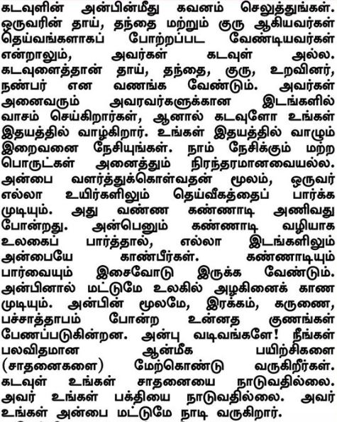Concentreer je op de liefde van God. Hoewel iemands moeder, vader en leraar gerespecteerd en bewonderd mogen worden als goddelijke wezens; ze zijn God niet. God dient vereerd te worden als moeder, vader, leraar, familielid en vriend. Ze hebben elk hun eigen verblijfplaats, maar God woont in je hart. Heb God lief die in je hart verblijft. Alle andere vormen van liefde zijn vergankelijk. Door zuivere liefde te ontwikkelen, zal je het Goddelijke zien in alle wezens. Het is alsof je een bril draagt met gekleurde glazen. Als je de wereld door de bril van zuivere liefde ziet, zie je overal liefde. Je ‘bril’ en je inzichten dienen met elkaar in overeenstemming te zijn. Alleen met liefde kan je schoonheid in de wereld waarnemen. Hierdoor zal je nobele eigenschappen zoals mededogen en empathie kunnen ontwikkelen. Belichamingen van liefde! Je praktiseert verschillende spirituele oefeningen (sadhana's). God vraagt deze sadhana niet. Hij zoekt ook je toewijding niet. Hij verlangt alleen jouw liefde.