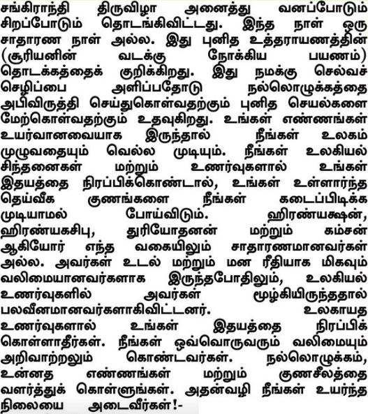 Η γιορτή του Σανκράντι έρχεται με όλη της την ομορφιά και λαμπρότητα. Δεν πρόκειται για μια συνηθισμένη ημέρα. Σηματοδοτεί την απαρχή της ιερής Ουτταράγιανα (βόρεια πορεία του Ήλιου). Μας παρέχει αφθονία, ευημερία και μας βοηθά ν’ αναπτύξουμε αρετές και ν’ αναλάβουμε ιερές δραστηριότητες. Μπορείτε να κατακτήσετε τον κόσμο ολόκληρο όταν οι σκέψεις σας είναι ευγενείς. Όταν γεμίζετε την καρδιά σας με εγκόσμιες σκέψεις και συναισθήματα, δεν θα μπορέσετε ν’ ασκήσετε τις έμφυτες θεϊκές σας ιδιότητες. Ο Χιρανιάκσα, ο Χιρανιακασίπου, ο Ντουριόντανα και ο Κάμσα δεν ήταν με κανέναν τρόπο συνηθισμένοι άνθρωποι. Αν και υπήρξαν ισχυροί ως προς το σώμα και τον νου, κατέληξαν αδύναμοι καθώς βυθίστηκαν σε εγκόσμια συναισθήματα. Μη γεμίζετε την καρδιά σας με κοσμικά συναισθήματα. Είστε όλοι προικισμένοι με μεγάλη δύναμη και ισχυρή διάνοια. Αναπτύξτε αρετές, ευγενείς σκέψεις και άψογο χαρακτήρα και θα επιτύχετε την άνοδο σε μεγάλα ύψη.