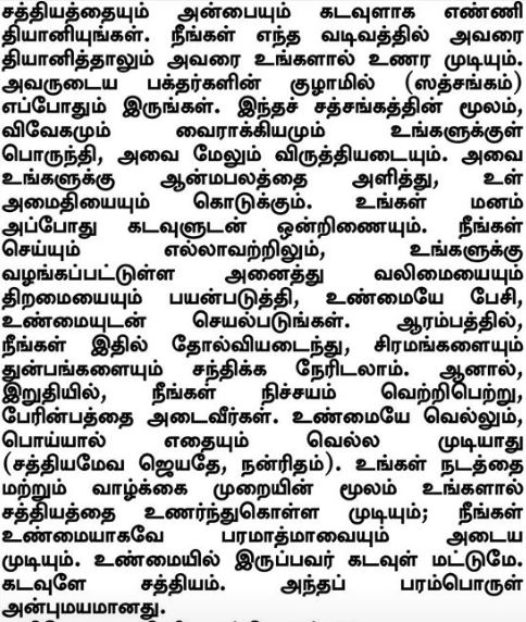 Medite em Deus como Verdade, como Amor. É possível conscientizar-se do Divino em qualquer forma sobre a qual se medite. Esteja sempre na boa companhia (satsanga) de Seus devotos. Através dessa boa companhia, o discernimento e o desapego (viveka e vairagya) serão implantados e desenvolvidos. Esses dois fortalecerão o espírito e lhe concederão paz interior. Sua mente então se fundirá em Deus. Em tudo o que fizer, fale e aja com verdade, usando toda força e talento com os quais for dotado. A princípio, você poderá falhar nisso e encontrar dificuldades e sofrimentos. Mas, no fim, está destinado ao sucesso e a alcançar a vitória e a bem-aventurança. Somente a verdade triunfa, nunca a falsidade (satyameva jayate, nanritam). Através do seu comportamento e seu modo de vida, você poderá compreender a Verdade; poderá de fato compreender Deus (Paramatma). Somente Deus é real. Deus é a Verdade. O Supremo Senhor é Amor.