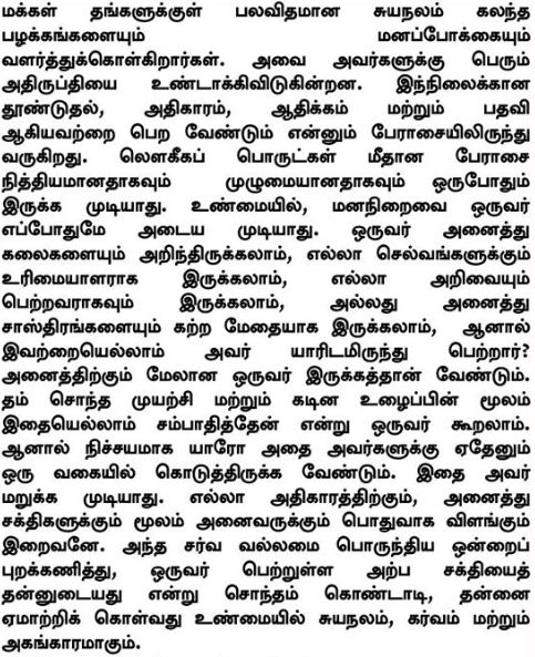 Οι άνθρωποι αναπτύσσουν εντός τους ένα πλήθος εγωιστικών συνηθειών και συμπεριφορών, προκαλώντας δυσφορία στον ίδιο τον εαυτό τους. Το κίνητρο για όλ’ αυτά είναι η απληστία για εξουσία, κυριαρχία και δύναμη. Η απληστία για τα πράγματα ποτέ δεν μπορεί να είναι διαρκής και κορεσμένη. Στην πραγματικότητα είναι αδύνατον να επιτευχθεί το επίπεδο του κορεσμού. Μπορεί να αισθάνεστε ενθουσιασμό με το να είστε δάσκαλος όλων των τεχνών, ιδιοκτήτης όλου του πλούτου, κάτοχος όλης της γνώσης ή γνώστης όλων των γραφών, αλλά ποιος είναι ο πάροχος όλων αυτών; Θα πρέπει να υπάρχει κάποιος σπουδαιότερος. Θα μπορούσατε να ισχυριστείτε πως ολ’ αυτά τα κερδίσατε με τη δική σας προσπάθεια, εργασία και μόχθο. Όμως σίγουρα κάποιος τα παρείχε στη μία ή την άλλη μορφή. Αυτό δεν μπορεί ν’ αμφισβητηθεί. Η πηγή από την οποία προέρχεται όλη η εξουσία και η δύναμη είναι ο Κύριος του παντός. Το ν’ αγνοείτε αυτήν την παντοδυναμία, ξεγελώντας τον εαυτό σας, πως η μικρή δύναμη που κατέχετε είναι δική σας, είναι πράγματι εγωισμός, έπαρση και αλαζονεία.