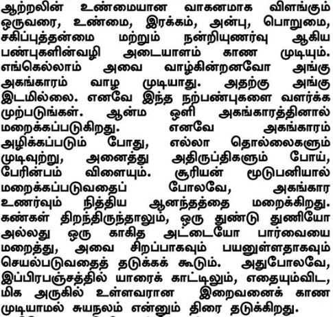 Eine Person, die ein echtes Vehikel der Macht ist, kann an den Merkmalen von Wahrheit, Güte, Liebe, Geduld, Nachsicht und Dankbarkeit erkannt werden. Wo immer diese leben, kann das Ego (Ahamkara) nicht bestehen. Es hat keinen Platz. Deshalb bemüht Euch, diese Tugenden zu entwickeln. Die Ausstrahlung des Göttlichen Selbst (Atma) wird durch das Ego verdeckt. Wenn das Ego zerstört wird, enden alle Probleme, alle Unzufriedenheiten verschwinden und Glückseligkeit wird erreicht. So wie die Sonne vom Nebel verdeckt wird, verbirgt das Gefühl des Ego die ewige Glückseligkeit. Selbst wenn die Augen offen sind, kann ein Stück Stoff oder Pappe verhindern, dass das Sehen effektiv und sinnvoll funktioniert. Auch der Schirm der Selbstsucht hindert jemanden daran, Gott zu sehen, der tatsächlich näher ist als irgendjemand anderes im Universum.