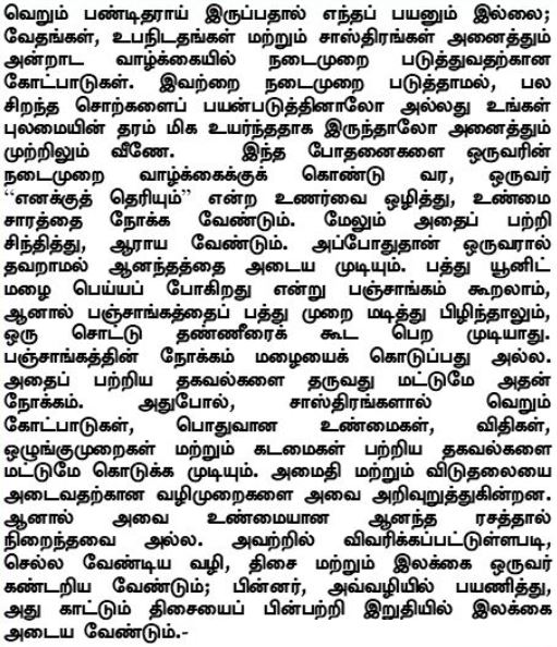Bloße Gelehrsamkeit nützt überhaupt nichts. Die Veden, die Upanishaden und die heiligen Schriften sind Lehren für das tägliche Leben. Ohne diese Praxis ist alles eine kolossale Verschwendung, unabhängig von der Fülle der Wörter oder dem Standard der Wissenschaft. Um diese Lehren in sein tatsächliches Leben zu bringen, muss man das Gefühl „Ich weiß“ im Keim ersticken, die Augen für das wahre Wesen öffnen und selbst darüber nachdenken. Dann kann man Glückseligkeit ohne Misserfolg erlangen. Der Bauernkalender könnte anzeigen, dass es zehn Einheiten Wasser regnen wird, aber selbst wenn der Kalender zehnmal gefaltet und zusammengedrückt wird, kann kein Tropfen Wasser extrahiert werden. Der Zweck des Kalenders ist nicht, Regen zu geben, sondern nur, Informationen darüber zu geben. Auch die heiligen Schriften können nur Informationen über Lehren, Axiome, Regeln, Vorschriften und Pflichten enthalten. Sie unterweisen in den Methoden, Frieden und Befreiung zu erlangen. Aber sie sind nicht mit diesen Essenzen der Glückseligkeit gesättigt. Man muss den Weg, die Richtung und das Ziel entdecken, wie in ihnen beschrieben. Dann hat man den Weg zu beschreiten, der Richtung zu folgen und das Ziel zu erreichen.