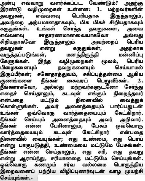 Πώς καλλιεργείται η αγάπη; Μέσα από δύο μεθόδους: α) Πάντοτε να θεωρείτε τα λάθη των άλλων, όσο μεγάλα κι αν είναι, ως ασήμαντα κι αμελητέα. Πάντα να θεωρείτε τα δικά σας λάθη, όσο ασήμαντα και ανάξια λόγου κι αν είναι, ως σημαντικά και να λυπάστε και να μετανοείτε ειλικρινά. Μέσω αυτών των μεθόδων βοηθάτε τον εαυτό σας να μη διαπράττει μεγάλα σφάλματα. Επίσης αποκτάτε τις αρετές της αδελφοσύνης και της ανεκτικότητας. β) Ό,τι κι αν κάνετε, μόνοι σας ή με τους άλλους, κάνετέ το, ενθυμούμενοι πως ο Θεός είναι πανταχού παρών. Βλέπει και ακούει τον κάθε σας λόγο και γνωρίζει την κάθε σας πράξη. Ό,τι κι αν λέτε, να θυμάστε πως Εκείνος είναι ακροατής της κάθε σας λέξης. Να διακρίνετε μεταξύ του αληθινού και του απατηλού και να λέτε την αλήθεια. Ό,τι κι αν κάνετε, να ξεχωρίζετε το σωστό από το λάθος και να πράττετε μόνον το σωστό. Προσπαθείτε κάθε λεπτό να ζείτε με την επίγνωση του παντοδύναμου Θεού.