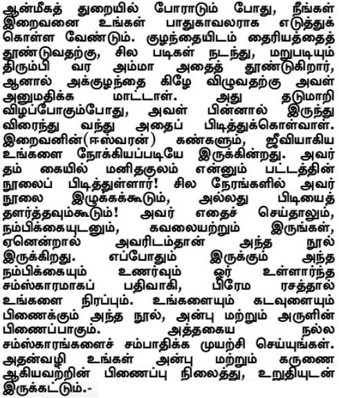 В борьбе на Духовном пути вы должны принять своим Защитником и Покровителем Самого Господа. Чтобы вселить в ребёнка смелость и уверенность, мать убеждает его пройти несколько шагов и повернуть обратно, но она не даёт ему упасть. Если ребёнок споткнулся и утратил равновесие, она спешит к нему и поддерживает его, прежде чем он упадёт. Господь тоже не сводит глаз с человека (дживы). Он держит каждого человека за верёвочку, как будто бумажного змея! Иногда Он может потянуть за верёвочку, а иногда - ослабить натяжение. Но что бы Он ни делал, сохраняйте Спокойствие и Уверенность, ибо все верёвочки находятся в Его Руках. Такая Непоколебимая Вера со временем превратится в благоприятную самскару (наклонность ума) и наполнит вас Нектаром Божественной Любви (Према-Расой). Нить, связывающая вас с Богом - это узы Любви и Милости. Поэтому стремитесь обрести такие Благоприятные самскары (наклонности ума), чтобы эти узы Любви и Милости могли существовать и укрепляться.