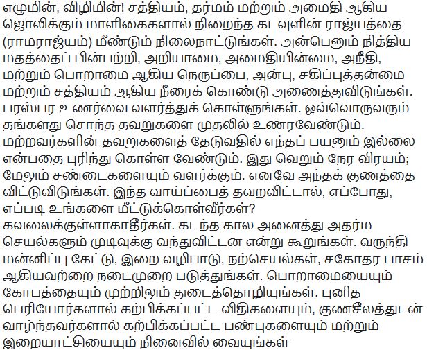 Steht auf, erwacht! Errichtet wieder das Reich Gottes (Ramarajya), das mit Villen der Wahrheit, Der Gerechtigkeit (Dharma) und des Friedens glänzt. Übt die ewige Religion der Liebe, löscht die brennenden Flammen der Unwissenheit, Friedlosigkeit, Ungerechtigkeit und Neid mit den Wassern der Liebe, Nachsicht und Wahrheit. Entwickelt das Gefühl der Gegenseitigkeit. Jeder sollte seine eigenen Fehler erkennen und verstehen, dass es nichts nützt, in anderen nach Fehlern zu suchen. Es ist nur Zeitverschwendung. Es führt auch zu Streit. Also gebt diese Eigenschaft auf. Wenn diese Gelegenheit verpasst wird, wann und wie werdet Ihr Euch selbst erlösen? Gebt nicht der Niedergeschlagenheit nach, sondern sagt 'finis' zu all den Taten der Ungerechtigkeit der Vergangenheit. Büßt aufrichtig und betretet den Weg des Gebets zu Gott, guter Taten und brüderlicher Liebe. Fegt alle Eifersucht und Wut weg. Denkt daran, die Regeln, die von heiligen Persönlichkeiten gelehrt werden, Eigenschaften, die von den Bedeutendsten und der Herrschaft Gottes gelebt und gelehrt werden.