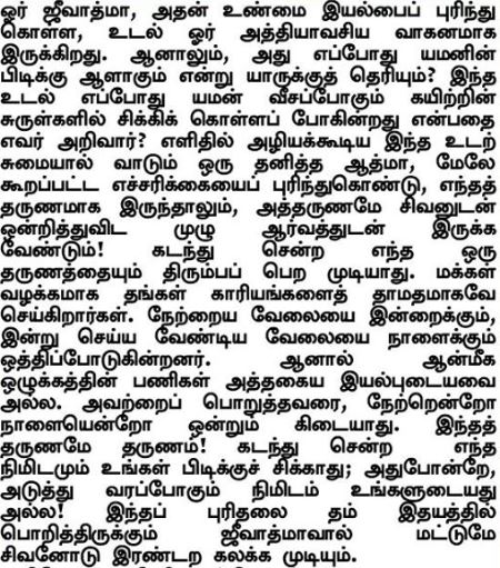 Le corps est le véhicule essentiel qui permet à l'âme individuelle de comprendre sa véritable nature. Pourtant, qui sait quand il pourrait devenir la cible de l'attention de Yama (le Seigneur de la mort) ? Qui sait quand ce corps sera piégé dans les boucles des cordes de Yama ? L'âme individuelle, accablée par ce corps facilement destructible, doit saisir l'avertissement mentionné ci-dessus et être impatiente de fusionner dans Siva, quel que soit le moment, ce moment même ! Aucun moment passé ne peut être annulé. Les gens retardent généralement leurs activités, le travail d'hier à aujourd'hui et celui d'aujourd'hui à demain. Mais les tâches de la discipline spirituelle ne sont pas de cette nature. Pour eux, il n'y a ni hier ni demain. Le moment présent est le moment présent ! La minute qui vient de s'écouler est hors de votre portée ; de même, la minute qui approche n'est pas la vôtre ! Seule l'âme individuelle qui a cette compréhension gravée dans son cœur peut se fondre dans Shiva.
