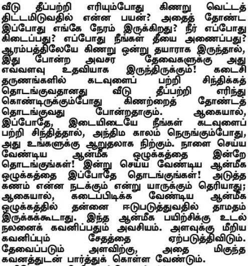 Was nützt es, einen Brunnen zu planen, wenn das Haus in Flammen steht? Wo ist die Zeit, ihn jetzt zu graben? Wann wird Wasser verfügbar? Wann könnt Ihr das Feuer löschen? Wenn am Anfang ein Brunnen bereit wäre, wie hilfreich wäre er bei solch kritischen Anlässen! In den letzten Momenten über Gott nachzudenken, ist wie damit anzufangen den Brunnen zu graben, wenn das Haus in Flammen steht. Wenn ihr also jetzt über Gott nachdenkt, ab und zu, wird es euch gut stehen, wenn das Ende naht. Beginnt heute mit der spirituellen Disziplin, die morgen getan werden muss! Fangt jetzt die spirituelle Disziplin an, die heute getan werden muss! Man weiß nicht, was im nächsten Moment auf Lager ist. Daher sollte es keine Verzögerung geben, sich in der spirituellen Praxis zu engagieren, die getan werden muss. Körperliche Ausdauer ist auch für diese spirituelle Praxis notwendig, so dass der Körper gepflegt werden muss, obwohl Das Pflegen über die Maße Schaden verursacht. In dem Maße, in dem es notwendig ist, sollte er mit großer Sorgfalt gepflegt werden.