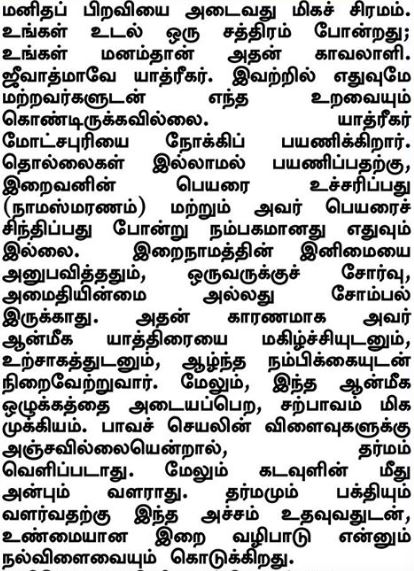 من الصعب الحصول على حياة إنسانية، فكيف تهدرها لتصبح عبثية؟ إن الجسد يشبه العربة، والفكر هو الحارس والنفس هي الحاج ولا يوجد أي علاقة قرابة أو نسب بينهم. إن غرض الحاج هو الوصول إلى مدينة الخلاص. ومن أجل رحلة خالية من الصعاب لا يوجد شيء يمكن الاعتماد عليه أفضل من ترديد اسم الإله. عندما تتم تجربة حلاوة ذلك الاسم فإن الفرد سوف لن يتعب و سوف لن تستنزف طاقاته أو يصبح ضحية للكسل. سوف يُكمل حجه بالممارسة الروحية المنضبطة بفرح وحماس وبعقيدة راسخة، و من أجل الحصول على هذه الممارسة الروحية فإن الاستقامة ضرورية جداً. إذ بدون الخوف من الإثم فإن الاستقامة لا تنشأ ولا يمكن أن تتطور محبة الإله، إن هذا الخوف ينتج عنه المحبة والتي تنشأ عن الممارسة الروحية.