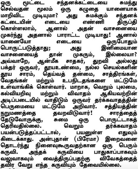 Μπορεί ένα γαϊδούρι να μετατραπεί σε ελέφαντα, μεταφέροντας απλώς ένα δεμάτι σανταλόξυλο; Μπορεί να είναι σε θέση να εκτιμήσει το βάρος του, αλλά όχι το άρωμά του! Όμως ο ελέφαντας δεν νοιάζεται για το βάρος. Εισπνέει τη γλυκιά ευωδιά, έτσι δεν είναι; Κατά τον ίδιο τρόπο, ο πνευματικός αναζητητής, ο απαρνητής, ο πιστός θα κρατήσει μόνον την καθαρή αλήθεια, την καθαρή ουσία των ενάρετων πράξεων, της ευσέβειας, των Γραφών, των Βεδών και των Ουπανισάδων. Από την άλλη πλευρά, εκείνος που συνεχίζει να επιχειρηματολογεί για χάρη των γνώσεων, της λογιότητας και της επιχειρηματολογίας, θα γνωρίσει μόνο το βάρος της λογικής και θα χάσει το άρωμα της αλήθειας! Για όσους αναζητούν την ουσία, το βάρος δεν παρουσιάζει ενδιαφέρον. Εάν χρησιμοποιείτε μόνο τη λογική, δεν κερδίζετε τίποτα άξιο λόγου. Η αγάπη είναι το πιο μεγάλο και σημαντικό εργαλείο για να έχετε τον Θεό διαρκώς στη σκέψη σας. Μαζί με αυτό το εργαλείο, που πρέπει να διατηρείτε ισχυρό και σε χρήση, το μόνο που χρειάζεστε είναι το όπλο της διάκρισης.