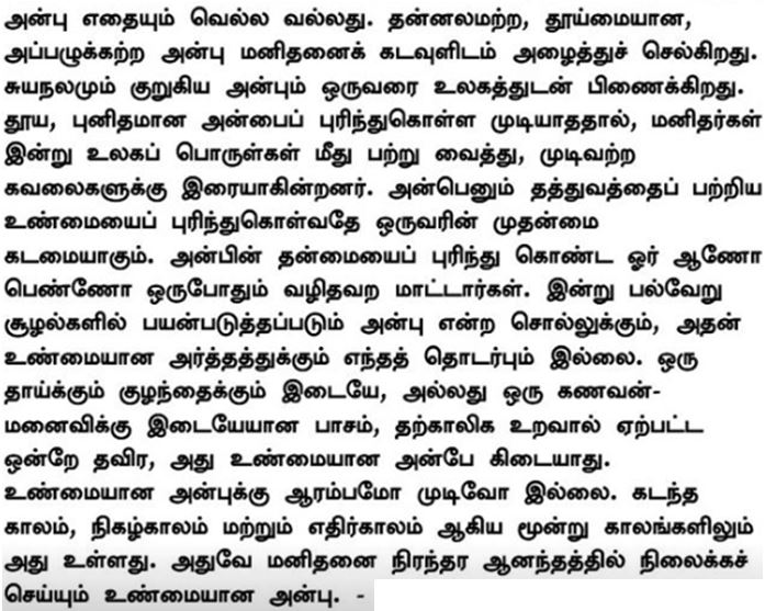 Η αγάπη μπορεί να κατακτήσει τα πάντα. Η ανιδιοτελής, καθαρή, αγνή αγάπη οδηγεί τον άνθρωπο στον Θεό. Η εγωιστική και περιορισμένη αγάπη σας κρατάει δεμένους με τον κόσμο. Αδύναμοι οι άνθρωποι να κατανοήσουν την αγνή και ιερή αγάπη, γίνονται βορά των ανησυχιών χωρίς τέλος εξαιτίας της προσκόλλησής τους στα πράγματα του κόσμου. Το πρωταρχικό σας καθήκον είναι ν’ αντιληφθείτε την αλήθεια που αφορά την έννοια της Αγάπης. Όταν κατανοήσετε την φύση της αγάπης, δεν θα παρεκκλίνετε. Τα διάφορα πλαίσια μέσα στα οποία χρησιμοποιείται σήμερα η λέξη ‘αγάπη’ δεν έχουν καμία σχέση με την αληθινή σημασία της αγάπης. Η τρυφερότητα ανάμεσα στη μητέρα και το παιδί ή μεταξύ των συζύγων είναι επακόλουθο μιας εφήμερης σχέσης και δεν είναι καθόλου αληθινή αγάπη. Η πραγματική αγάπη δεν έχει αρχή και τέλος. Υπάρχει και στις τρεις διαστάσεις του χρόνου -–παρελθόν, παρόν και μέλλον. Μόνον αυτή είναι αληθινή αγάπη που μπορεί να γεμίσει τον άνθρωπο με διαρκή ευδαιμονία.