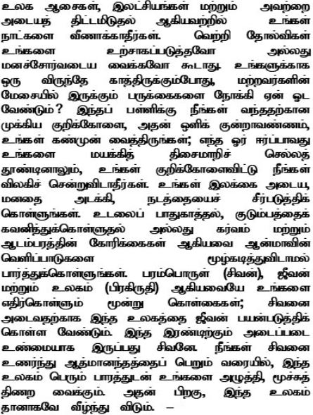 Nie marnuj dni na rozwijanie ziemskich pragnień i dążeń, a także planowanie, jak je zrealizować. Zwycięstwo ani porażka nie mogą wywoływać u ciebie zachwytu ani przygnębienia. Jeśli czeka na ciebie uczta, to po co miałbyś biegać za tym, co spadło ze stołów innych ludzi? Wyraźnie utrzymuj przed oczyma główny cel, zadanie, dla jakiego przyszedłeś do tej szkoły. Nie rezygnuj, niezależnie od pokus, jakie kuszą cię, abyś zszedł na złą drogę. Panuj nad umysłem, kontroluj zachowanie, by osiągnąć cel. Nie pozwól, aby troska o ciało, utrzymanie rodziny lub pycha i ostentacja były ważniejsze niż wezwanie ducha do wyrażania siebie. Najwyższa rzeczywistość (Śiwa), jednostka (dżiwa) i prakriti (świat przedmiotowy) to trzy zasady, jakie napotykasz. Jednostka musi czerpać ze świata, aby dotrzeć do Śiwy, który jest ich podstawową prawdą. Dopóki nie osiągniesz błogości atmy dzięki zjednoczeniu z Śiwą, świat będzie przygniatał cię swoim ciężarem i niemal dusił, a później zniknie sam z siebie.