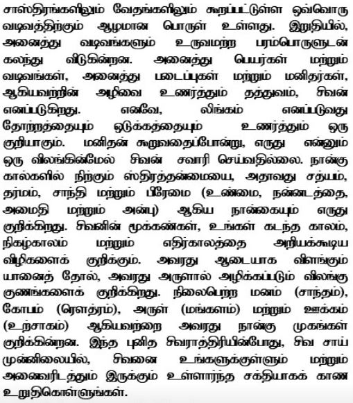 إن كل شكل تقوم الكتب المقدسة بوصفه لنا يكون له معنى عميق. في النهاية تندمج كل الأشكال مع المطلق عديم الشكل، الذي يُرمز له بالمولى شيفا رمز الإله الهادم لكل الأسماء والصور ولكل الكينونات والأفراد. لذلك فإن الشكل البيضوي الكروي هو ابسط أشكال الانبثاق والاندماج. إن المولى شيفا لا يمتطي حيواناً يسمونه البشر ثوراً، فالثور هو رمز للاستقرار القائم على قوائم أربعة ألا وهي الصدق والفضيلة والسلام والمحبة. أما عيون شيفا الثلاثة فهي رمز لرؤية الماضي والحاضر والمستقبل. أما جلد الفيل الذي يرتديه كعباءة يمثل الفطرة البهيمية التي تدمرها بركاته المقدسة. أما وجوهه الأربعة فهي تمثل الاتزان والانفعال والبركات والطاقة الصاعدة. اعقدوا العزم في يوم شيفاراتري أي عيد شيفا هذا، بحضرة وعي شيفا المتمثل بالحكيم ساي أن تتصوروا المولى شيفا كمولى القدرة الداخلية بداخلكم وبداخل كل شيء.