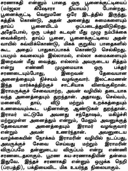 Der Weg der Hingabe ist wie der eines Kätzchens (marjala kishora nyaya), das einfach an einem Ort miaut und all seine Lasten auf die Mutterkatze legt. In ähnlicher Weise setzt der Devotee volles Vertrauen auf Gott. Die Mutterkatze hält das Kätzchen im Mund und transportiert es sicher durch auch sehr enge Passagen. Wenn der Devotee alle Lasten auf den Herrn legt, ohne Angst oder Sorge, und sich voll seinem Willen hingibt, wird er sicherlich alles zur Verfügung stellen. Lakshmana ist der Zeuge dieses Weges. Um Rama zu dienen, verzichtete Lakshmana vierzehn volle Jahre lang auf alle Hindernisse auf seinem Weg - Reichtum, Frau, Mutter, Zuhause und sogar Schlaf und Nahrung. Er fühlte, dass Rama sein Alles, sein Glück und seine Freude war, und gewährte ihm alles, was er brauchte. Sein Lebenszweck war nur, ihm zu folgen, ihm zu dienen und seinen Willen ihm zu übergeben. Das ist das Merkmal der völligen Selbstübergabe. Diese Disziplin der Hingabe (Prapatti) ist der der Demut (bhakti) sehr überlegen.