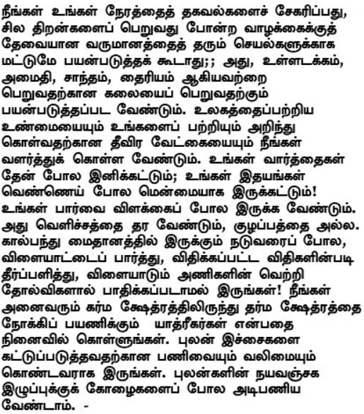 Eure Zeit muss nicht nur für das Sammeln von Informationen und das Sammeln bestimmter Fähigkeiten verwendet werden, die Euch ein Einkommen geben, von dem Ihr leben könnt. Sie muss auch verwendet werden, um die Kunst des Seins zufrieden und ruhig, gesammelt und mutig zu erwerben. Ihr müsst auch einen glühenden Durst kultivieren, die Wahrheit der Welt und euer eigenes Selbst zu kennen. Lasst eure Worte wie Honig sein und Eure Herzen so weich sein wie Butter! Euer Blick muss wie die Lampe sein - erhellend, nicht verwirrend. Seid wie der Schiedsrichter auf dem Fußballplatz, beobachtet das Spiel, beurteilt das Spiel nach den Regeln, unbeeinflusst von Erfolg oder Misserfolg eines Teams gegen ein anderes! Denkt daran, Ihr seid alle Pilger, die sich entlang dieses Land des Handelns (Karma kshetra) zum Ziel des Landes der Gerechtigkeit (Dharma kshethra) bewegen. Seid demütig und stark, um Versuchungen zu widerstehen. Gebt nicht wie Feiglinge den verklungenen Unterstellungen der Sinne nach.