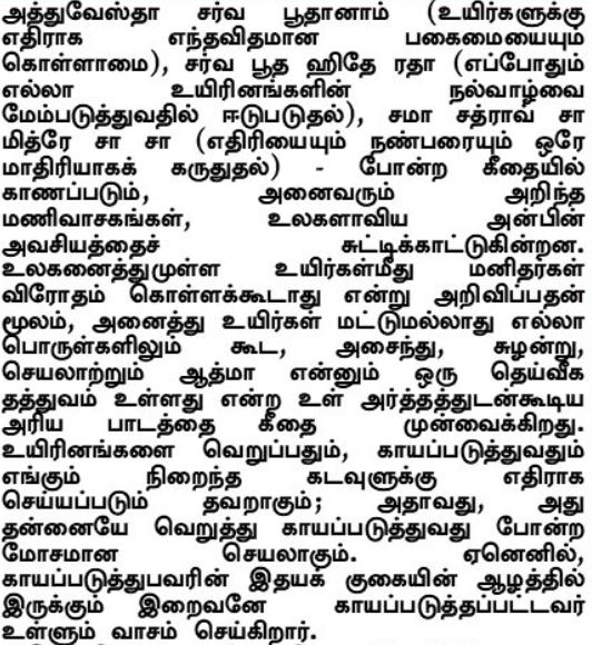 Advesta Sarva Bhutanam (ertrage keinen bösen Willen gegen das Lebewesen), Sarva Bhuta Hite Ratah (immer für das Wohlergehen aller Wesen werben), Samah Shatrau Cha Mitre Cha Cha (Betrachte Feind und Freund gleichermaßen) - Juwelen wie diese in der Gita sind, wie allen bekannt, Hinweise auf die Notwendigkeit der universellen Liebe. Indem die Gita erklärt, dass der Mensch gegenüber der gesamten Welt der Lebewesen keinen bösen Willen tragen soll, setzt sie eine Lehre mit unschätzbarer innerer Bedeutung, dass es in allen Wesen und sogar in allen Dingen ein bewegendes, sich drehendes und aktives Erleuchtungsprinzip gibt, das ist das Göttliche, angemessen als Atma bezeichnet. Es ist falsch gegen Gott, dieses allgegenwärtige Göttliche, Lebewesen zu hassen, es zu verletzen. Das heißt, es ist so schlimm wie sich selbst zu hassen und zu verletzen - der Grund dafür ist, dass der Verletzer ebenso ein Lebewesen bei Gott als sein Kern ist, wie der Verletzte.