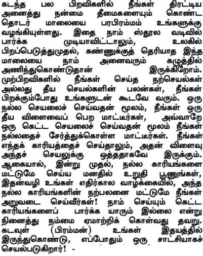 Tuhan yang tertinggi telah menganugrahkanmu sebuah kalung bunga yang tidak bisa putus dari semua akumulasi kebaikan dan keburukan dari kehidupan sebelumnya. Sejak dari lahir, kalung bunga yang tidak terlihat ini dipakai oleh setiap orang di leher mereka, walaupun seseorang tidak bisa melihatnya secara fisik. Buah dari apapun kebaikan atau keburukan yang telah engkau lakukan di masa lalu, telah datang bersamamu pada saat engkau lahir. Dengan melakukan perbuatan yang baik, engkau tidak akan mendapatkan hasil yang buruk dan dengan melakukan perbuatan yang buruk, engkau tidak akan mengumpulkan kebaikan. Apapun jenis pekerjaan yang engkau lakukan, hasilnya akan sesuai dengan jenis pekerjaan itu. Maka dari itu, mulai dari sekarang, buatlah pikiranmu hanya melakukan kebaikan saja dan oleh karena itu engkau akan mendapatkan hanya keuntungan dari kebaikan saja di kehidupan yang akan datang! Dengan membayangkan dan menipu diri sendiri dalam berpikir bahwa tidak ada yang melihat kita melakukan perbuatan yang buruk, adalah tidak benar. Tuhan (Brahman) bersemayam di dalam hatimu sendiri dan selalu berfungsi sebagai saksi!