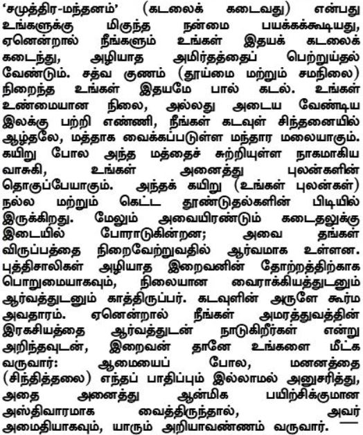 Η ανάδευση του ωκεανού (που αναφέρεται στις γραφές πουράνας) έχει μεγάλη αξία για σας, γιατί κι εσείς πρέπει να αναδεύσετε τον ωκεανό της καρδιάς σας ώστε να κερδίσετε το νέκταρ της αθανασίας. Η καρδιά σας, που στα βάθη της είναι γεμάτη με αγνότητα και αταραξία, είναι ο ωκεανός του γάλακτος. Ο σταθερός διαλογισμός του Θεού είναι το βουνό Μάνταρα που τοποθετήθηκε σε αυτόν ως αναδευτήρας. Το φίδι Βασούκι, που τυλίχτηκε γύρω από τον αναδευτήρα ως σχοινί, είναι το σύνολο των αισθήσεών σας. Το σκοινί των αισθήσεων κινητοποιείται από τις καλές και κακές παρορμήσεις σας, οι οποίες ανταγωνίζονται μεταξύ τους κατά τη διαδικασία της ανάδευσης, ανυπόμονες για τα αποτελέσματα που η καθεμία από αυτές επιθυμεί διακαώς. Θα πρέπει με σοφία να περιμένετε υπομονετικά τη Χάρη του Θεού, με σταθερό ζήλο και αμείωτο ενδιαφέρον. Τότε, ο ίδιος ο Κύριος έρχεται προς σωτηρία σας, γνωρίζοντας ότι αναζητάτε με ειλικρίνεια το μυστικό της αθανασίας. Έρχεται σιωπηλά και απαρατήρητος –όπως έκανε τότε που εμφανίστηκε στον ωκεανό ως χελώνα– με τη μορφή της συνεχούς σκέψης Του ως σταθερής βάσης όλων των πνευματικών σας ασκήσεων.