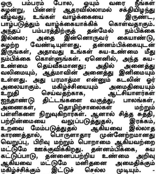 Le simple fait de tourner comme une toupie, jusqu'à ce qu'on ne puisse plus tourner, puis tomber impuissant et inerte, est une existence morne et dévastatrice. La toupie n'a pas confiance en elle-même ; elle doit être manipulée et tournoyée par une autre. Ayez confiance en vous, c'est-à-dire ayez confiance en votre Soi. Car ce Soi est divin ; il a en lui toute la force, toute la douceur de l'Atman, qui n'est qu'une vague de l'océan de Paramatman (Réalité suprême). Afin d'assurer le bonheur et la paix, les administrateurs élaborent des plans quinquennaux et construisent des ponts, des barrages, des usines et des écoles. Mais sans la purification de l'esprit, le renforcement du détachement, la promotion de la compassion et de la solidarité, le progrès économique ne fait que promouvoir la haine, la faction et l'envie. La confiance en soi, la maîtrise de soi et la connaissance de soi sont les seuls éléments qui peuvent conduire l'homme à la paix et à la joie.