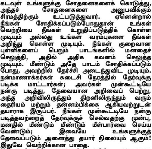 Nie rozpaczaj, gdy Pan poddaje cię testom i ciężkim próbom w formie sprawdzianów, ponieważ tylko wtedy, gdy jesteś testowany, możesz zapewnić sobie powodzenie lub uświadomić sobie własne ograniczenia. Wówczas możesz skoncentrować się na przedmiotach, w których masz braki i poświęcić im więcej uwagi po to, abyś mógł je zaliczyć, gdy będziesz ponownie zdawał test. Dobrzy studenci nie uczą się do egzaminu w ostatniej chwili; przygotowują się dobrze wcześniej, przyswajają potrzebną wiedzę i podchodzą do niego z odwagą i pewnością, jaką daje wiedza i umiejętności. Przed egzaminem wystarczy jedynie powtórzyć opanowany wcześniej materiał; to wszystko, co należy zrobić! Oto droga do zwycięstwa.