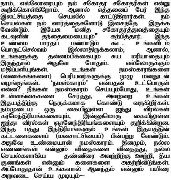 Kita mengatakan bahwa semuanya adalah saudara dan saudari kita, namun berapa banyak yang menerjemahkan itu menjadi sebuah perbuatan yang ideal? Perbuatan kita seharusnya selaras dengan perkataan kita. Jesus mengajarkan “Persaudaraan manusia dan ke-Esaan Tuhan”. Kebenaran ini juga adalah budaya dari Bharat. Engkau mungkin tidak memiliki kekayaan materi; namun adalah cukup jika engkau memiliki kepercayaan diri dan rasa hormat diri. Hormati setiap orang. Persembahkan rasa hormatmu (Namaskar) kepada yang lebih tua dengan sepenuh hati. Apa makna yang ada dibalik dari Namaskar? Ketika engkau melakukan Namaskar, engkau mencakupkan kedua telapak tanganmu dan membawanya dekat ke hatimu. Lima jari dari setiap tangan melambangkan lima indera perbuatan (Karmendriya) dan lima indera rangsangan (Jnanendriya). Kesepuluh indera ini harus mengikuti perintah dari hatimu (suara hati). Itu adalah Namaskar yang sebenarnya. Setiap hari, taburlah benih-benih pemikiran yang baik, sirami benih tersebut dengan perbuatan baik dan cabutlah sifat-sifat yang jahat. Hanya dengan demikian engkau akan memanen kebahagiaan.