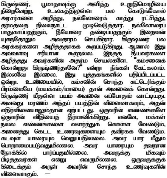 Krishna, indem er das Versprechen erfüllte, das er Mutter Erde gegeben hatte, befreite die Welt von vielen bösen Herrschern und versuchte, die Herrschaft der Gerechtigkeit zum Schutz des Guten zu etablieren. Das Göttliche inkarniert von Alter zu Alter, um die Tugendhaften zu beschützen, die Gottlosen zu bestrafen und Gerechtigkeit zu schaffen. Krishna soll viele böse Menschen zerstört haben. Aber das ist nicht ganz richtig. Es ist ihre eigene Schlechtigkeit, die diese bösen Menschen zerstört hat. Man kann fragen: "Ist es nicht Krishna, der Kamsa getötet hat?" Überhaupt nicht. Dies ist die Textbuchversion. In Wahrheit war es Kamsas eigenes erhitztes Bhrama (Wahn), das ihn tötete. Er wurde immer von der Angst Krishnas verfolgt. Sein Tod war ein Ergebnis und eine Reaktion dieser Angst. Die Gedanken bestimmen das Schicksal. Daher sollten die Menschen gute Gedanken kultivieren und alle schlechten Gefühle vermeiden. Gott hat keine Abneigung gegen irgendjemanden. Er beneidet niemanden. Er hat keinen schlechten Willen gegenüber irgendjemandem. Er hat auch keine Favoriten. Die Gnade, die man bekommt, ist das Ergebnis der eigenen Gefühle.