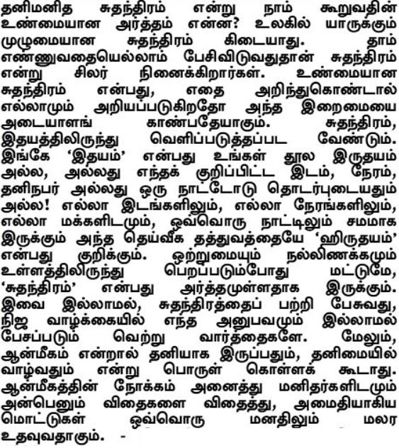 Apa yang benar-benar kita maksudkan dengan kebebasan individu? Tidak ada satupun orang di dunia yang memiliki kebebasan yang absolut. Beberapa orang berpikir bahwa kebebasan adalah kemampuan berbicara tentang apapun yang mereka rasakan. Kebebasan yang sebenarnya terdiri dari menyadari kualitas ke-Tuhan-an, yang mana dengan mengetahuinya maka semua yang lainnya diketahui. Kebebasan seharusnya mengungkapkan dirinya dari hati. ‘Hati’ dalam hal ini bukanlah hati fisikmu, atau terkait dengan tempat, waktu atau individu atau bangsa tertentu! ‘Hrudayam' mengacu pada prinsip ke-Tuhan-an yang sama-sama hadir di setiap tempat, di sepanjang waktu dan di semua orang, di setiap bangsa. Hanya ketika kesatuan dan keharmonisan dicapai di dalam diri maka kebebasan akan menjadi berguna. Tanpa adanya semua ini, berbicara tentang kebebasan hanyalah kata-kata kosong belaka, tanpa pengalaman apapun di dalam hidup yang sesungguhnya. Juga, jangan berpikir bahwa spiritual berarti menjadi sendiri dan tinggal di dalam kesunyian. Tujuan dari spiritual adalah untuk menanam benih kasih di dalam umat manusia dan memungkinkan kedamaian mekar di dalam setiap pikiran.