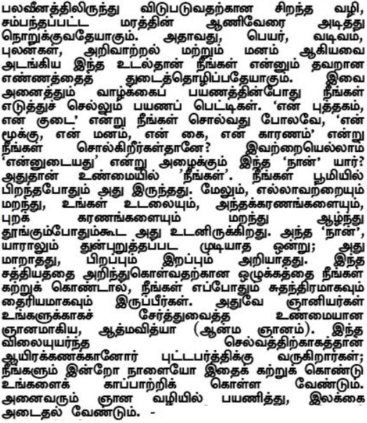 Cara terbaik untuk melenyapkan kelemahan adalah menyerang pada akarnya pohon – yaitu kesalahan bahwa engkau adalah tubuh, dengan nama dan wujud ini, indera-indera yang ada, kecerdasan ini dan pikiran ini. Semuanya ini adalah beban yang engkau bawa. Bukankah engkau berkata, ‘hidungku, pikiranku, tanganku, alasanku’, seperti yang engkau katakan, ‘bukuku, payungku’? siapakah ‘aku’ yang menyebutkan semua ini adalah 'milikku'? itu adalah ‘dirimu’ yang sejati. Itu ada disana Ketika engkau lahir, saat tidur engkau melupakan semua yang lainnya, bahkan melupakan tubuhmu dengan semua perlengkapannya, internal dan eksternal. Ketahuilah bahwa ‘aku’ itu tidak bisa disakiti; tidak mengalami perubahan, tidak mengenal kematian atau kelahiran. Belajarlah disiplin yang membuatmu sadar akan kebenaran ini dan engkau akan selalu bebas dan berani. Itu adalah vidya yang sejati, Aatmavidya (pengetahuan tentang diri sejati), yang telah dikumpulkan oleh para guru suci untukmu. Ribuan orang yang datang ke Puttaparthi adalah datang kesini untuk kekayaan yang berharga ini; engkau juga harus, suatu hari nanti, belajar hal ini dan menyelamatkan dirimu sendiri. Semua harus mencapai tujuan, berjalan di sepanjang jalan kebijaksanaan.