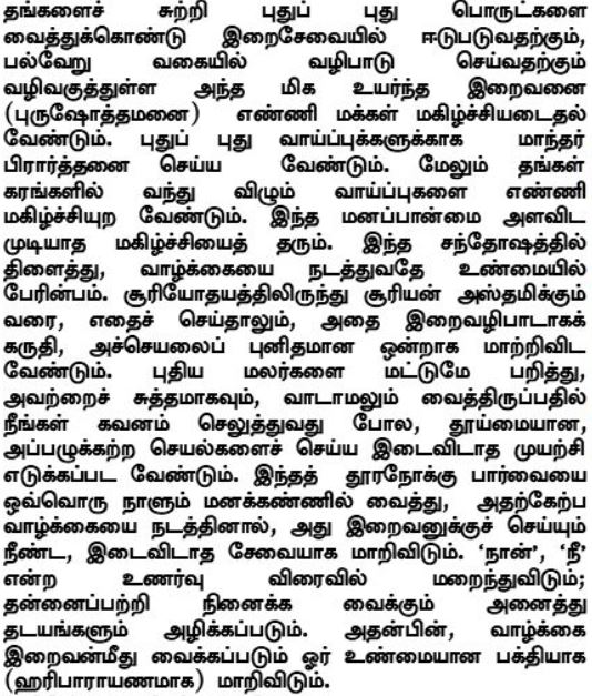 Wees dankbaar dat de allerhoogste God (Purushothama) je steeds nieuwe mogelijkheden schenkt om Hem te dienen en Hem op verschillende manieren te vereren. Vraag God om steeds nieuwe gelegenheden en verheug je in de kansen die je geboden worden. Zo’n houding geeft onmetelijke vreugde. Een leven leiden vervuld van deze vreugde, is een gelukkig leven. Draag al je taken van ’s morgens tot ’s avonds op aan God. Net zoals men alleen verse bloemen plukt en ze optimaal verzorgt om ze fris te houden, dien ook jij er onophoudelijk voor te zorgen dat al je handelingen zuiver en correct zijn. Als je deze visie steeds voor ogen houdt en praktiseert, wordt alles wat je doet een ononderbroken stroom van dienstbaarheid aan God. Het gevoel van 'ik' en 'jij' zal dan snel verdwijnen. Alle sporen van egoïsme zullen vernietigd worden. Het leven transformeert zich dan in toewijding aan God (Hariparayana).