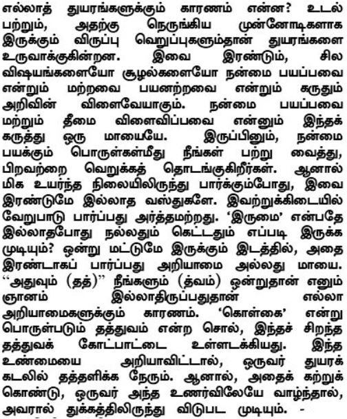 ما هو بالضبط سبب كل الشقاء والأحزان؟ إن التعلق بالجسد هو ما يولّد الحزن والشقاء ناهيك عما يجرّه من مرغوبات ومكروهات. وهذان الأمران ينتجان عن العقلية الازدواجية التي تعتبر أموراً وظروفاً معينة على أنها نافعة وأشياء وظروف أخرى بأنها خلاف ذلك. إن هذه الفكرة التي تتبنى المنفعة والمضرة تورث الضلال، فيبقى الفرد أسير الأشياء التي يعتبرها نافعة له وكارهاً لغيرها من الأشياء. إلا أنه من نظرة سامية للوجود لا وجود لكليهما، والتفريق بينهما يصبح بلا معنى. طالما ليس هناك ازدواجية على الإطلاق، فكيف يمكن أن يكون هناك جيد وسيء؟ فعندما ترى ازدواجية في حين لا وجود إلا للأحدية فهذا جهل أو ضلال. وإن جذر كل الجهل هو غياب معرفة النفس بأن أنت أنا وحقيقتك هي عين باطني المعروف باللفظ السنسكريتي تاتوا والتي تعني الأصل أو المبدأ، فتمسكوا بهذه النظرة الفلسفية العظيمة. وما لم يتم التحقق من هذه الحقيقة، سيعاني الفرد ويتخبط بمحيط البؤس والشقاء، لكن إن تم إدراكها وسلك الفرد طريق وعيها، عندها سيتحرر من الحزن والشقاء.