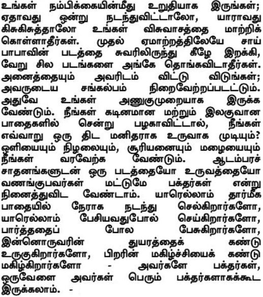 اثبتوا على إيمانكم ولا تضعفوا في ولائكم وإخلاصكم عند حدوث أي شيء وبأقل كلمة يوسوس بها أحدهم، فلا تنزعوا صورة ساي بابا عن الجدار وتعلقوا صورةً أخرى عند أول خيبة أمل. فاتركوا الأمور له، لمشيئته لتجري فيكم، فهذا ما يجب أن تكون عليه نظرتكم الداخلية. فما لم تمروا بالعسر واليسر، كيف لعودكم أن يقوى؟ اقبلوا كلّاً من النور والظل، الشمس والمطر. ولا تعتقدوا بأن أولئك الذين يتعبدون لصورةٍ أو شكلٍ بطقوسٍ ظاهرية متكلفة جداً على أنهم مريدين مخلصين. أيّاً كان من يسير مستقيماً وفق صراط الأخلاق، وأيّاً كان من يتصرف بما يقول ويقول وفقاً لما يرى، وأيّاً كان من يتحرك قلبه لآلم الآخرين ويفرح لفرحهم - أولئك كلهم مريدون مخلصون، وإن كانوا مغمورين إلا أنهم ربما ذوي مقامٍ أعلى.