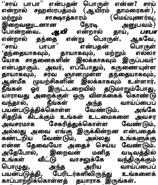 Wat is de echte betekenis van ‘Sai Baba’? Sai betekent duizend lotussen (Sahasrapadma), realisatie en rechtstreekse ervaring van God (sakshatkara), enzovoort. Ayi betekent moeder en Baba betekent vader. ‘Sai Baba’ betekent dus ‘Hij die zowel Vader als Moeder is en het doel van alle yoga-inspanningen’. Het betekent ook de Moeder die vervuld is van mededogen, de Vader met alle Kennis en inzicht en tevens het doel van spirituele inspanningen. Als je al tastend je weg zoekt in een donkere kamer, grijp dan je kans als iemand een lamp aansteekt. Haal dan haastig je bezittingen bijeen die hier en daar verspreid liggen of kijk snel rond om te ontdekken waar ze zich bevinden en doe zo vlug je kan al het nodige. Grijp op dezelfde manier je kans als God in menselijke vorm aan je deur staat en wees paraat om jezelf te redden van de duisternis.