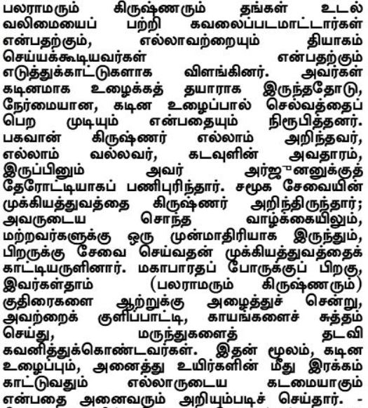 Balarama und Krishna waren Beispiele, die zeigten, dass sie sich nicht um ihre eigene körperliche Stärke kümmern und dass sie alles opfern würden. Sie waren bereit, harte Arbeit zu leisten und zeigten, dass Wohlstand durch aufrichtige harte Arbeit erreicht werden kann. Lord Krishna war allwissend, allmächtig und die inkarnierte Göttlichkeit, und dennoch arbeitete er als Wagenlenker für Arjuna. Krishna war einer, der die Bedeutung des Dienstes an der Gemeinschaft erkannte und durch seine eigene Praxis und indem er anderen ein Beispiel gab, zeigte er, dass der Dienst an anderen wichtig war. Nach der Schlacht von Mahabharatha waren dies die Menschen, die die Pferde zum Fluss brachten, sie wuschen und ihre Wunden versorgten und Medikamente anwendeten. Er zeigte damit, dass harte Arbeit und Mitgefühl für alle Lebewesen die Pflicht aller Menschen sind.
