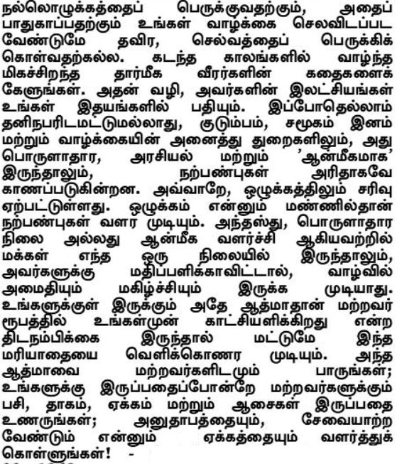 Η ζωή πρέπει να αναλωθεί στη συσσώρευση και τη διαφύλαξη της αρετής, όχι του πλούτου. Ακούστε και αναλογιστείτε τις ιστορίες μεγάλων ηρώων του παρελθόντος, έτσι ώστε τα ιδανικά τους να αποτυπωθούν στις καρδιές σας. Η αρετή γίνεται όλο και πιο σπάνια στις μέρες μας τόσο για το άτομο όσο και για την οικογένεια, την κοινωνία και την κοινότητα, σε όλους τους τομείς της ζωής, είτε αυτός είναι οικονομικός, πολιτικός όσο και πνευματικός. Επίσης, παρατηρείται μια φθίνουσα πορεία της πειθαρχίας, που είναι το έδαφος στο οποίο μεγαλώνει η αρετή. Αν ο καθένας δεν γίνεται σεβαστός, ανεξάρτητα από την κοινωνική του θέση, την οικονομική του κατάσταση ή την πνευματική του ανάπτυξη, δεν μπορεί να υπάρξει ειρήνη και ευτυχία στη ζωή. Αυτός ο σεβασμός μπορεί να προκληθεί μόνο από την πεποίθηση ότι ο ίδιος Εαυτός (Άτμα) που υπάρχει εντός σας, παίζει το ρόλο του άλλου ατόμου. Να βλέπετε αυτόν τον Εαυτό στους άλλους. Να νιώθετε ότι και αυτοί επίσης πεινούν, διψούν, ποθούν και επιθυμούν όπως κι εσείς. Αναπτύξτε τη συμπόνια και την αγωνία να υπηρετήσετε τους άλλους και να φροντίστε είστε χρήσιμοι!