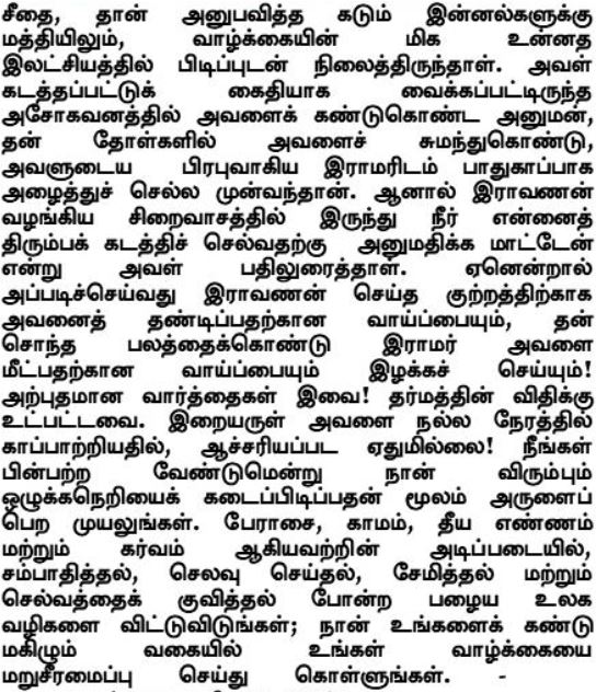 Sita trzymała się najwyższego ideału życia, pomimo strasznych cierpień, jakich zaznała. Hanuman, który odnalazł Sitę w ogrodzie, gdzie więził ją jej porywacz, zaproponował, że przekroczy ocean, niosąc ją na ramionach i bezpiecznie zabierze ją do Pana Ramy. Lecz Sita odpowiedziała, że nie pozwoli wyzwolić się z niewoli Rawany, gdyż wtedy Rama nie będzie mógł go ukarać za popełnione zbrodnie ani jej uratować dzięki własnemu heroizmowi! Cóż za wspaniałe słowa! Są one w pełni zgodne z zasadami dharmy! Nic dziwnego, że łaska Pana ocaliła Sitę we właściwym czasie! Staraj się zdobyć łaskę, przestrzegając takiej dyscypliny, jakiej pragnę, abyś przestrzegał. Porzuć stare doczesne sposoby zarabiania i wydawania, oszczędzania i gromadzenia z powodu chciwości, żądzy, złości i pychy; zmień swoje życie tak, abym był z ciebie zadowolony.