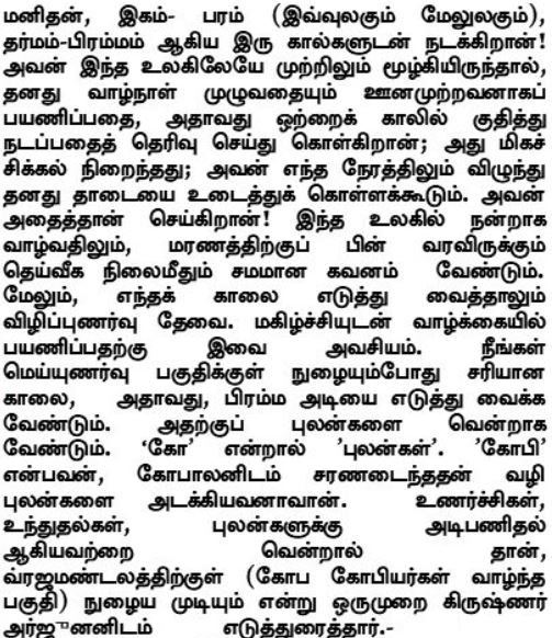 O ser humano anda com duas pernas: iha e para (este mundo e o outro), retidão (dharma) e Deus (Brahman)! Se ele estiver totalmente imerso neste mundo, ele estará escolhendo viajar toda sua vida com uma limitação, pulando de um pé só. Isso é repleto de problemas; ele pode cair a qualquer momento e quebrar seu queixo. E assim o faz! Bondade neste mundo, santidade para a vida além da morte — atenção igual a esses dois, e vigilância enquanto for dar um passo com qualquer um dos pés — esses são essenciais para uma jornada feliz pela vida. Você tem que colocar o pé direito, o passo de Brahman (Deus), quando entra na região da libertação. Até lá, os sentidos devem ser conquistados. ‘Go’ significa ‘sentidos’ e ‘Gopi’ significa uma pessoa que dominou os sentidos como consequência de sua rendição a Gopala, o mestre dos sentidos (Go). Krishna uma vez disse a Arjuna que ele só poderia entrar em Vraja Mandala (a região onde os pastores — Gopis e Gopas — viviam) depois de dominar suas emoções, impulsos e sua tendência de ceder aos sentidos.