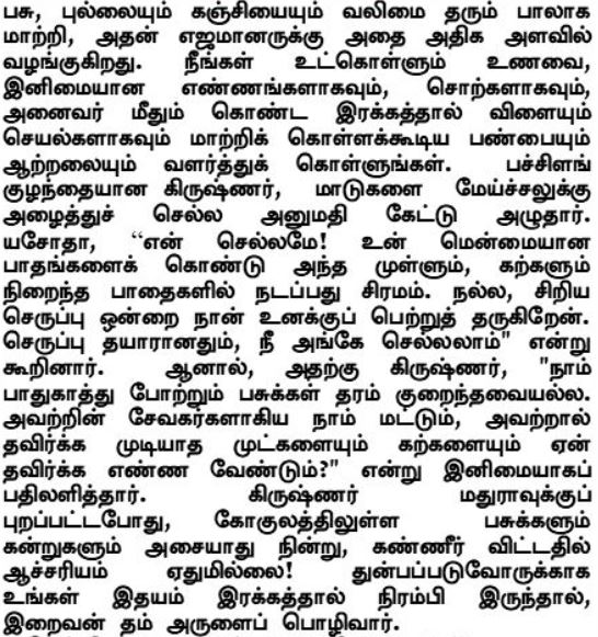 Η αγελάδα μετατουσιώνει το γρασίδι και τον χυλό σε γλυκό, δυναμωτικό γάλα και το προσφέρει σε αφθονία στον αφέντη της. Αναπτύξτε αυτήν την ποιότητα, αυτή τη δύναμη να μετατρέπετε την τροφή που καταναλώνετε σε γλυκές σκέψεις, λόγια και πράξεις συμπόνιας για όλους. Ο μικρός Κρίσνα έκλαιγε για να του επιτρέψουν να πάει μαζί με τις αγελάδες στα λιβάδια. H Γιασόντα είπε: «Αγαπητό μου παιδί! Τα μικροσκοπικά τρυφερά πέλματά σου δεν μπορούν να περπατήσουν σ’ αυτούς τους γεμάτους αγκάθια και βότσαλα δρόμους. Θα αγοράσω ωραία μικρά σανδάλια για σένα. Μπορείς να πας, αφού πρώτα ετοιμαστούν τα σανδάλια.» Αλλά ο Κρίσνα απάντησε γλυκά: «Οι αγελάδες τις οποίες υπηρετούμε δεν είναι πεταλωμένες. Γιατί πρέπει, εμείς, οι υπηρέτες τους, να αποφεύγουμε τα αγκάθια και τις πέτρες που εκείνες δεν μπορούν να αποφύγουν;» Έτσι, δεν ήταν παράξενο που οι αγελάδες και οι μόσχοι του Γκόκουλ έμειναν ακινητοποιημένοι και έκλαιγαν, όταν ο Κρίσνα έφευγε για τη Ματούρα! Όταν γεμίσετε την καρδιά σας με συμπόνια για τους άλλους, ο Κύριος θα σας πλημμυρίσει με τη Χάρη Του.