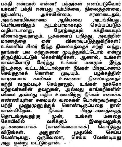 Czym jest oddanie? Kim są wielbiciele? Oddanie to wiara, pewność, moralność, nieulękłość, poddanie i brak egoizmu. Jednak wymyślne i okazałe oddawanie czci to zwykła strata czasu i energii. Dlaczego zrywasz kwiaty i przyspieszasz ich śmierć? Chodzisz dokoła Nilajam i cieszysz się, że zrobiłeś tyle okrążeń, lecz wielbicielem można nazwać cię dopiero wtedy, gdy twój umysł okrąży to miejsce razem z twoimi nogami. Zauważyłem, że kiedy nogi prowadzą cię dokoła z powodu siły przyzwyczajenia, wówczas twój język plecie o wadach innych, o cenie warzyw lub o potrawach, jakie zamierzasz przyrządzić na lunch. Zanim zaczniesz okrążenia, co nazywasz pradaksziną, ofiaruj swój umysł jako dakszinę (ofiarę dziękczynną) mieszkańcowi tej świątyni, Panu. To jest najważniejsze i być może jedyne, co trzeba zrobić.