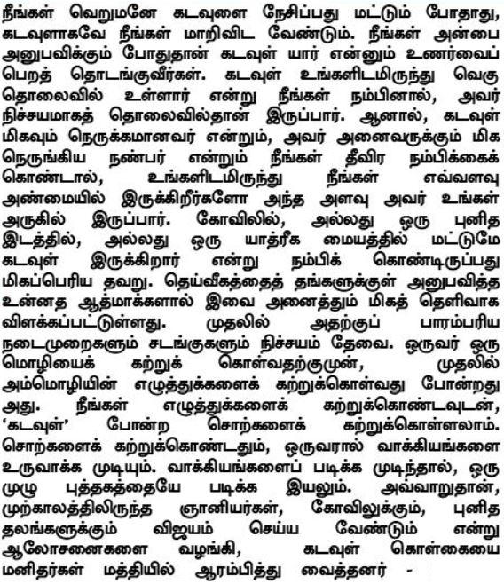ينبغي ألا تكون فقط محبّاً لله بل أن تصبح بذاتك أحدي الوعي به، وفقط عندما تختبر هذه المحبة سيبدأ معنى من هو الله بالتفتح لديك. فإن كنت تظن بأن الله بعيداً عنك، فحتماً ستختبره على أنه بعيد، إلا إنك لو اعتقدت اعتقاداً راسخاً أن الله بداخلك وأنه أعظم صديقٍ لك، عندها فهو قريبٌ إليك بقرب ذاتك لنفسك. إنه لخطأ جسيم بأن تعتقد أن الله موجودٌ فقط في المعبد أو بالأماكن المقدسة أو في مراكز الحج. إن القديسين العظماء الذين اختبروا الإلهية بداخلهم قد أوضحوا ذلك جيداً بشروحاتهم، وبالطبع نحتاج للتمارين التقليدية والطقوس الشعائرية كبداية، فهي مثل تعلم الحروف الأبجدية قبل تعلم اللغة. وما أن تتقن الحروف الأبجدية، يمكنك أن تتعلم الكلمات مثل كلمة ”الله“. وبعد تعلم الكلمات، يمكنك تشكيل عبارةٍ، وما أن تتمكن من قراءة عبارة، يمكنك عندها قراءة كتابٍ كامل. بنفس الطريقة، حكماء الماضي بدؤوا بتعليم الناس مفهوم الإله من خلال نصحهم لهم بزيارة المعابد والأماكن المقدسة، إلخ.