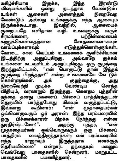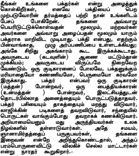 Когда резервуар наполнен доверху, вода начинает переливаться через край. Точно так же, когда Сердце человека переполняют Любовь, Сострадание и Вера, тогда его мысли, слова и поступки будут способствовать Миру, Покою, Радости и Процветанию. Однако политики не осознают важности и необходимости этого. Они загрязняют молодые Сердца ненавистью, завистью, жадностью и подстрекают молодых людей к насилию и вражде. Они уводят учащихся из классов, библиотек и лабораторий и побуждают бродить по улицам с лозунгами, дико себя вести, оскорблять невинных людей и разрушать их имущество. Индийская культура никогда не поощряла применение силы для изменения законов, социальных условий или взглядов людей. Ганди руководил движением за независимость Индии, основываясь на Духовных принципах. Он призывал людей развивать Храбрость и Уверенность в себе с помощью Повторения Имён Бога (Намасмараны) и размышления о Господе. Он очистил Сердца людей от ненависти, зависти, страха и сомнений. Ганди всегда следовал Высоким Идеалам и никогда не сворачивал с выбранного пути. Вы должны поступать так же.